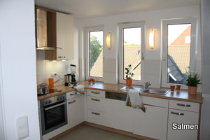 - Küche: Einbauküche in Kernbuche mit hellen Fronten und Geräten in Edelstahl-Optik.