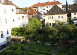 mit Blick in ein grünes Karree der angrenzenden Gärten.